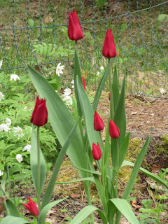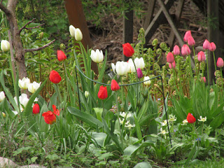 En löytänyt vieläkään kunnollisia muistiinpanojani tulppaaneista, joita viime vuonna istutin (tai siis mihin), mutta tänään muistin, että ostin viime hetkillä ison kasan valkoisia korkeita tulppaaneja, joita ripottelin eri penkkeihin, ajatuksella, että ne loisivat näihin penkkieni sekoitustulppaanien joukkoon yhtenäisyyttä.
